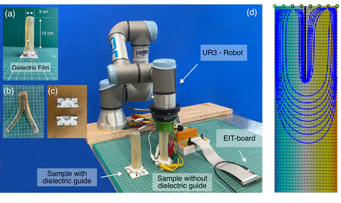 Sensing the deformation of soft robots is vital for effective control and interaction with the environment. Electrical impedance tomography (EIT) enables such sensing by monitoring changes in conductivity, but its sensitivity is often highest near the electrodes, limiting performance for distant deformations. Existing strategies to address this limitation typically rely on introducing conductive material heterogeneities, such as anisotropic or patterned conductors, to redirect current flow. In this work, a fundamentally different approach is presented - utilizing a dielectric guide to manipulate the electric field within the conductive body. This method leverages widely used soft robotic materials, such as silicone, in a new role as a passive electric field guide, allowing reconfiguration of sensitivity distributions without embedding conductive components. Physical experiments with a conductive hydrogel cylinder show that the dielectric guide increases deformation sensing accuracy by 21%, reduces sensitivity to noise, and enables a reduction in the number of required EIT channels. This work establishes dielectric-based field manipulation as a novel design strategy for high-fidelity, low-interference proprioception in soft robotics.